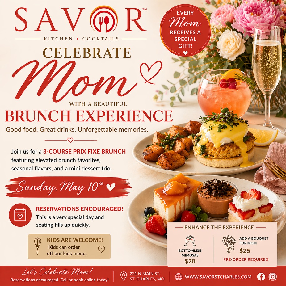 Celebrate Mom with an elevated 3-course brunch experience at Savor in the heart of Historic Main Street. Enjoy a thoughtfully curated menu featuring seasonal favorites and a mini dessert trio, along with handcrafted cocktails, bottomless mimosas, and more. Every mom will receive a special take-home gift to make the day even more memorable. Enhance the celebration with a pre-ordered bouquet for Mom, available for an additional charge. Kids are welcome and may order from our kids menu. Reservations are strongly encouraged as seating fills quickly.
