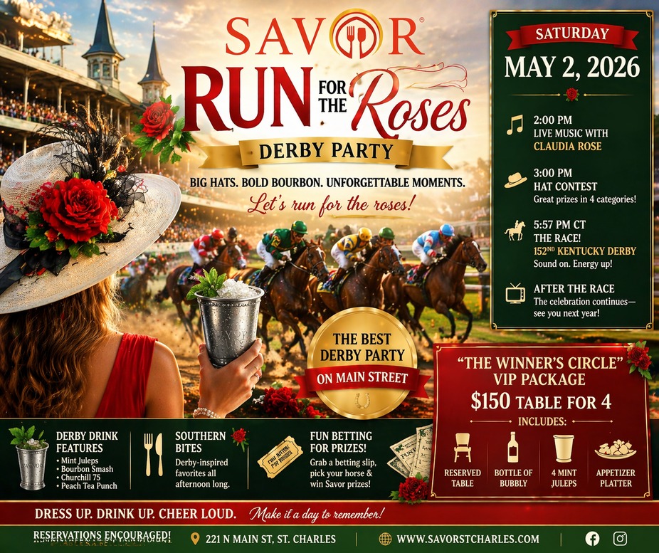 🌹 Join us at Savor for our Run for the Roses Derby Party—an afternoon of live music, bold bourbon cocktails, big hats, and Derby-day excitement on Main Street. 🐎